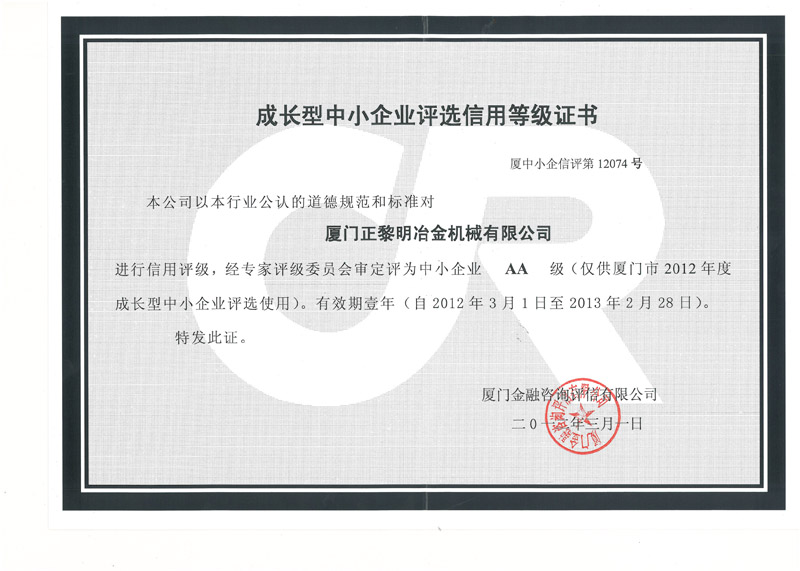 中小企业信用等级评测AA级