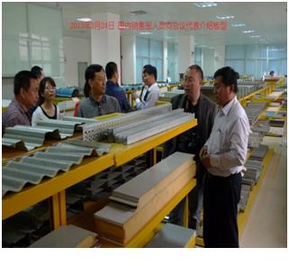 与会的代表有多家是我司的客户,目前尚有多台设备正在车间组装中,他们到车间生产现场看了他们的设备,了解进度与交货时间。大连海华的代表看完公司板型样品之后,即向我司订购一台闭口式楼承板成型机与半自动C型钢机。