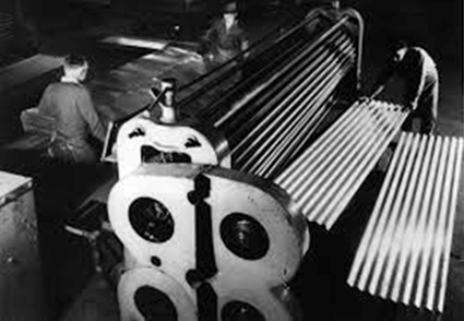 19世纪初期,因材料成本较低,人们仍偏向以锡板作为建筑屋面常用金属材料,镀锡薄钢板在美国得到广泛普及,人们尝试用锡板配以新的加工和安装技术制作金属屋面板,其中发展出卷边平扣屋面板连接方式,同时采用松香和铅锡焊密封板间缝隙,卷边平扣屋面板连接及密封板缝技术的出现,是金属屋面系统运用的开端。其后,伴随着钢铁加工工艺的发展,人们开始尝试用铁板等其它金属材料制作金属屋面系统,并开始应用到工业等其它领域,典型的有1829年,英国船坞公司的工程师亨利帕尔莫(HenryPalmer)设计一种瓦楞状的薄铁板被第一次工业化应用于英国船坞公司的货仓屋顶及墙面上,标志着压型金属板的正式应用。