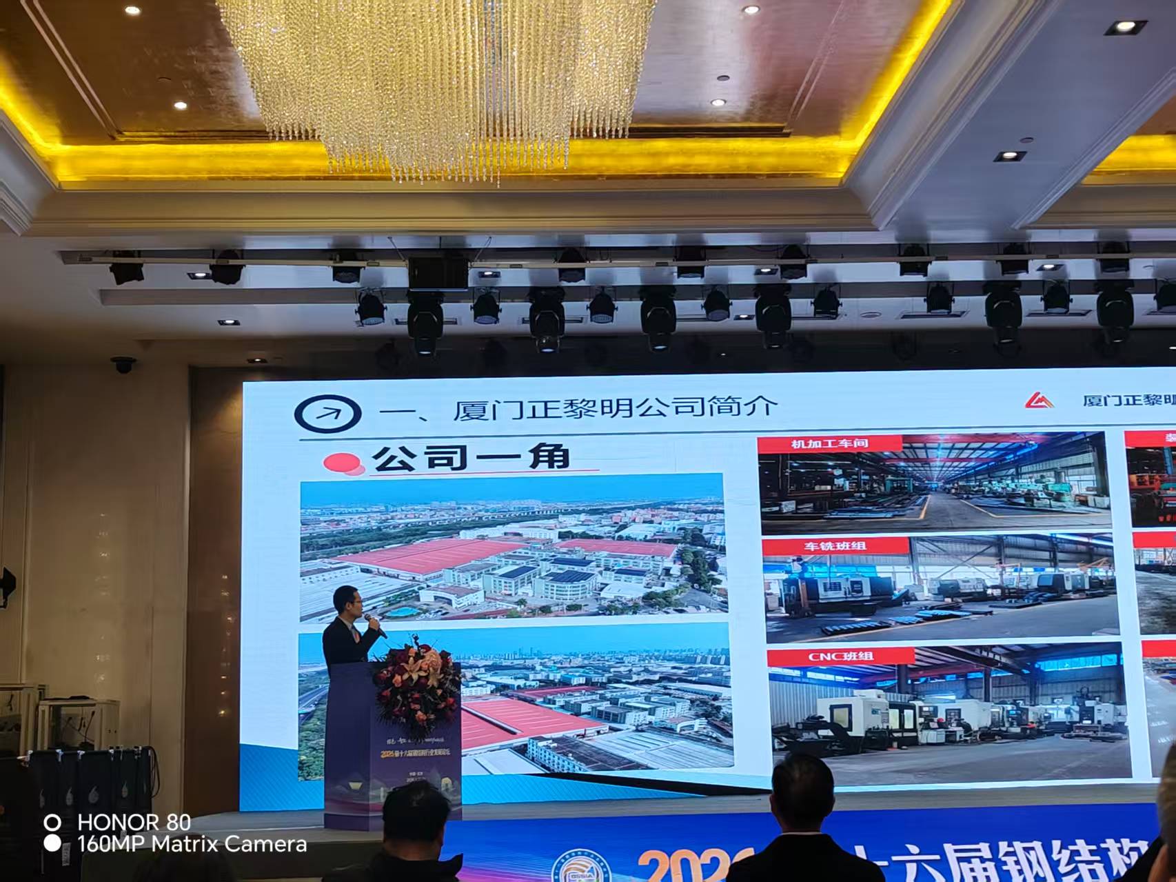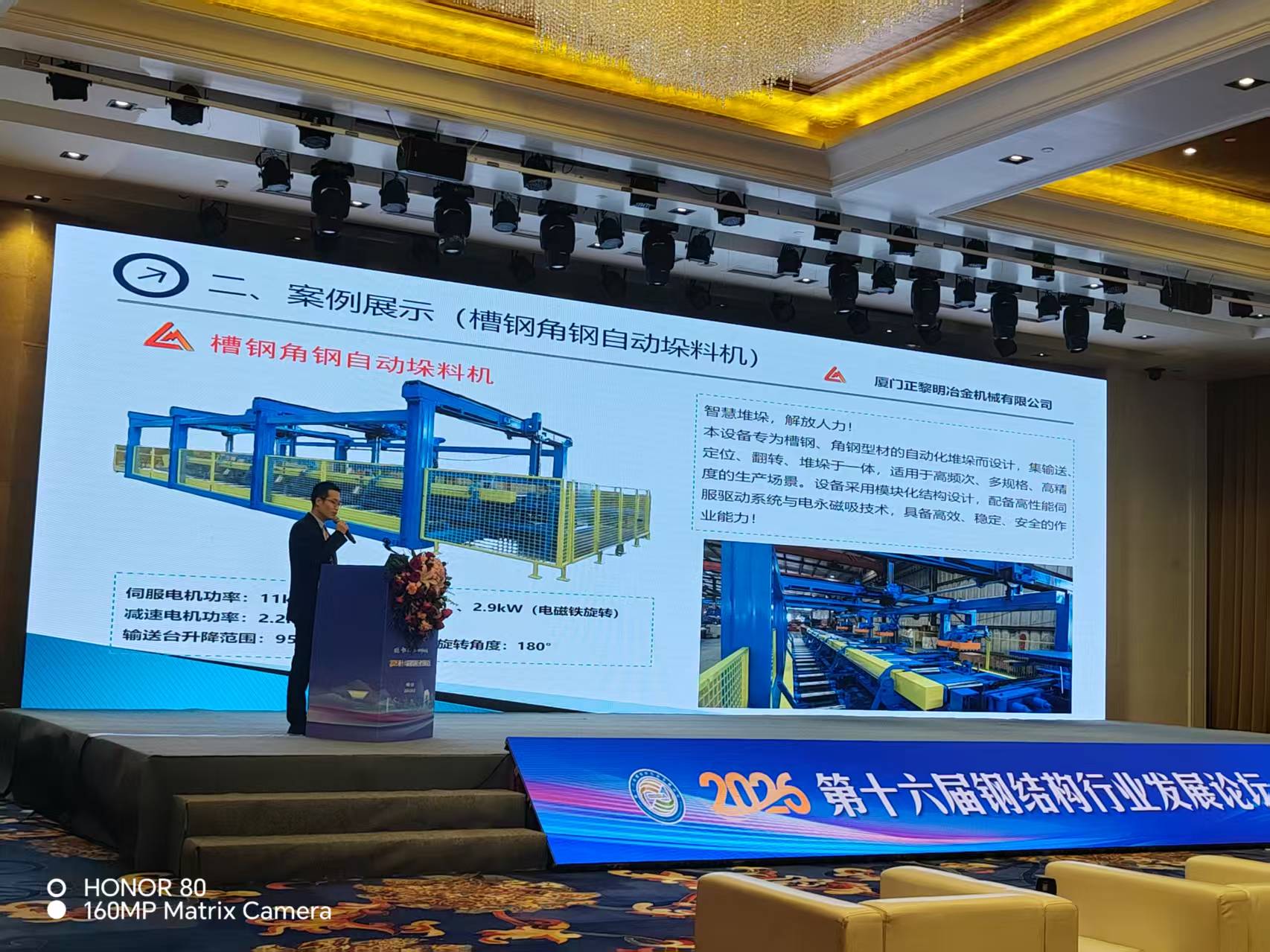 我司总经理杨勤成先生在大会上分享了名为《智能冷弯产线》的主题报告,深入探讨钢结构行业的绿色智造发展路径。杨勤成先生结合黎明多年技术积淀与制造经验,系统介绍了公司自主研发的CZ抱焊一体机、槽钢角钢自动垛料机、智能高速生产线、汽车尾板生产线等多款明星产品。尤为值得一提的是,他重点介绍了为C919国产大飞机生产基地临港二期工程配套研发的异形屋面板。 在数字化浪潮下,厦门黎明不仅致力于硬件创新,更在软件与服务端持续发力。杨勤成总经理在报告中阐述了手机端智能管理方案,用户可通过专属APP或微信小程序,随时随地掌握设备运行状态、订单进度、生产能耗等关键信息。 在新技术新产品展示区,黎明重点展示了智能冷弯生产线全系列核心装备,吸引了众多单位、钢结构加工企业驻足洽谈。 11日晚,以“匠心筑黎明,拓展耀九州”为主题的“黎明之夜”答谢晚宴在宴会厅隆重举行。行业协会领导、合作伙伴代表、权威专家等嘉宾出席,共同度过了一个热烈而难忘的夜晚。 晚宴在我司总经理杨勤成先生热情洋溢的致辞中正式拉开帷幕。杨总深情回顾了协会过去一年的奋斗历程,今日再次相会于“黎明之夜”万分荣幸,感谢每一位嘉宾的莅临与支持。希望在座的行业精英,群策群力,分享项目经验,探讨合作可能。在推动冷弯成型设备国产化、智能化及国际交流方面做出突出贡献,继续做中国钢结构装备的旗帜,从而走向更广阔的全球市场。